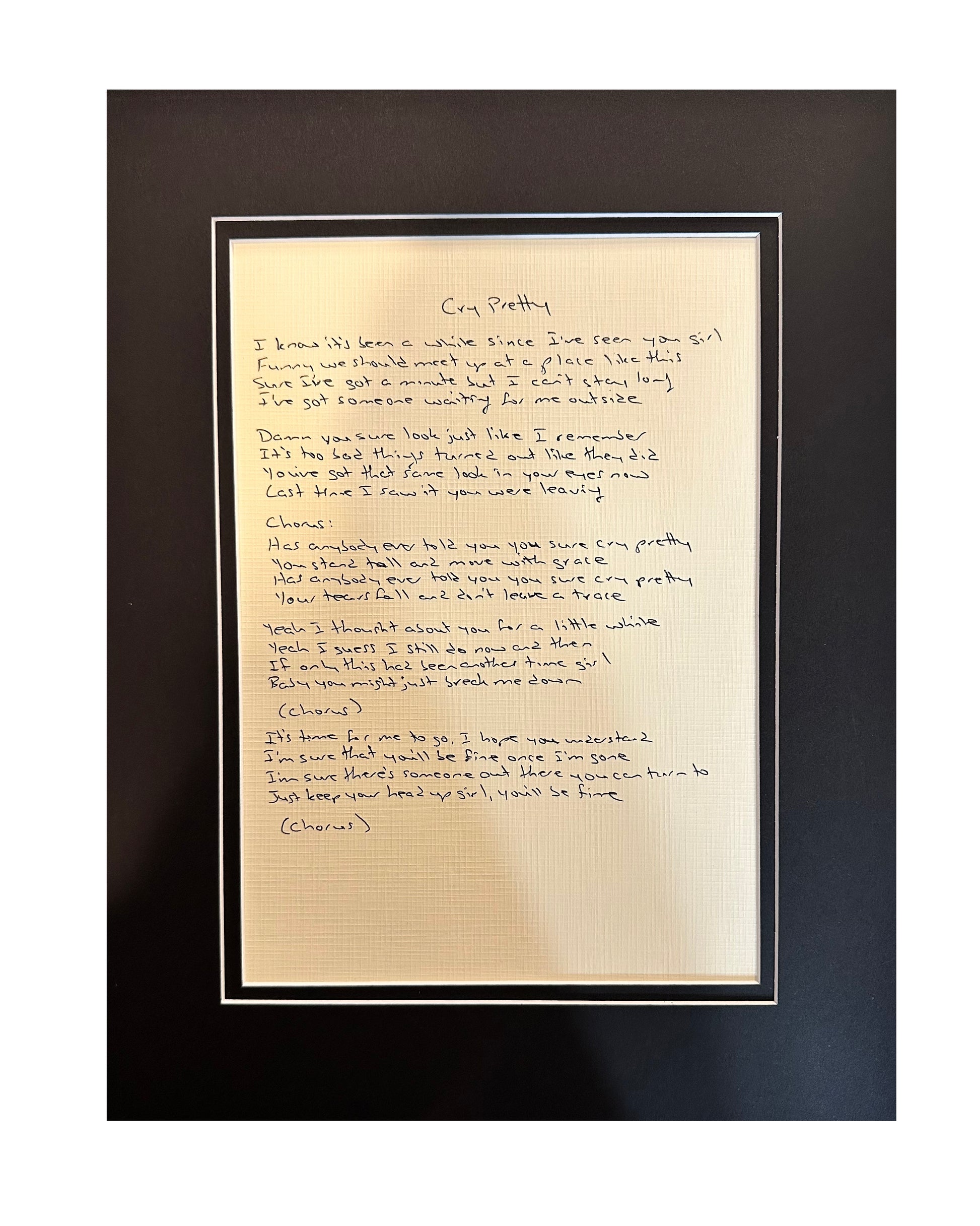 Handwritten lyrics for a song or songs of your choice. The lyrics will be autographed and written on 8.5x11 65lb cream colored card stock paper with an 11x14 black mat as shown in the image.